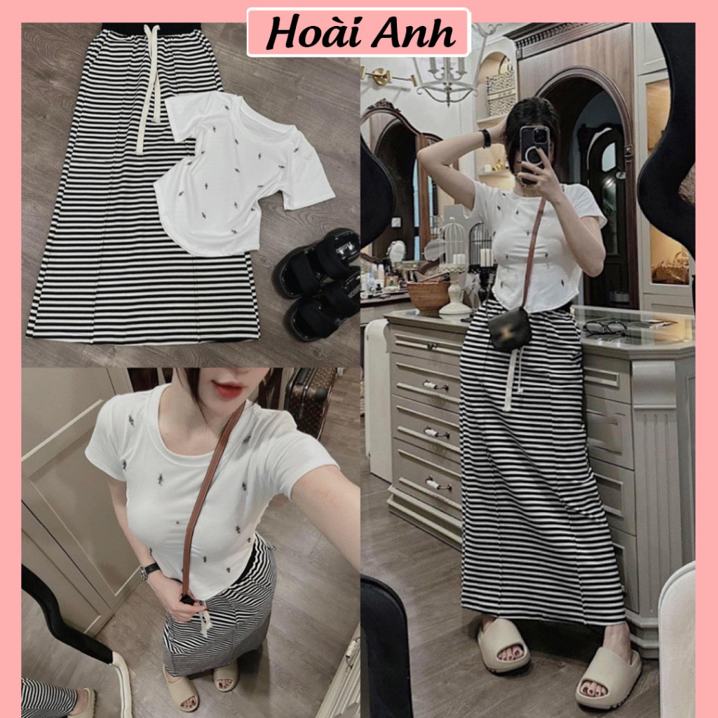Giới thiệu Set Bộ Đồ Nữ T-Chome Áo Croptop Vạt Bầu Mix Chân Váy Suông Kẻ Ngang Dáng Dài Freesize