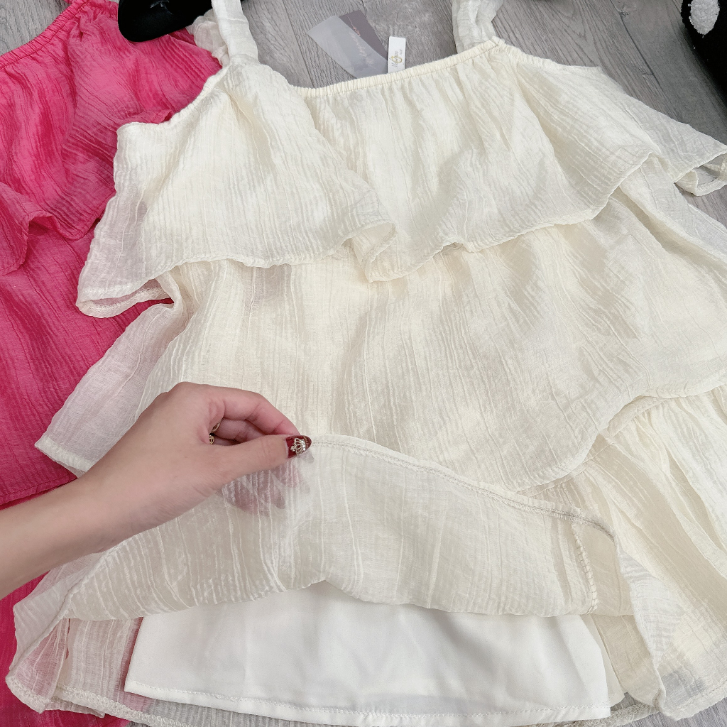 Set Bộ Đồ Nữ Tơ Đũi Sọc Nhăn Áo 2 Dây Bèo Tầng Có Lót Trong Mix Chân Váy Xòe 2 Lớp Freesize