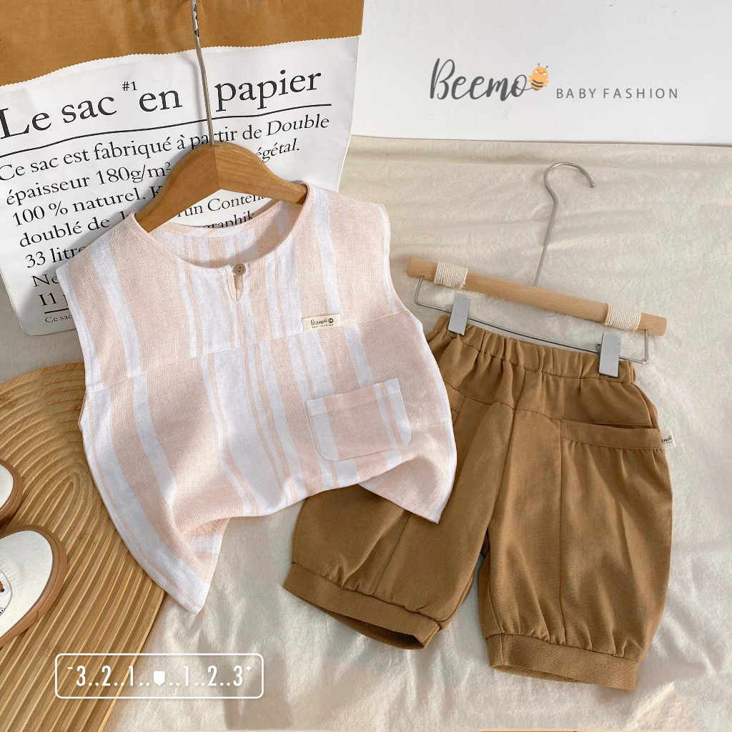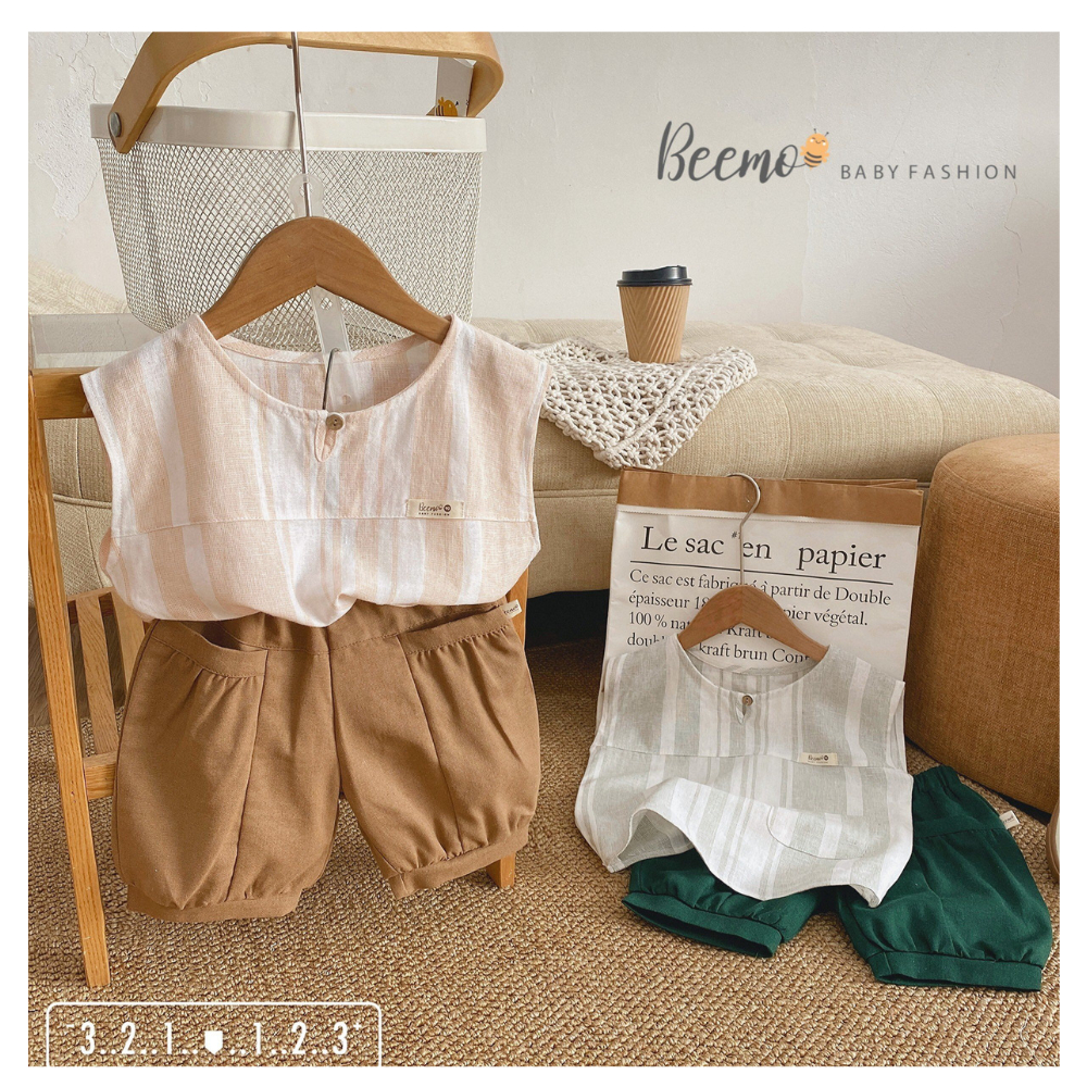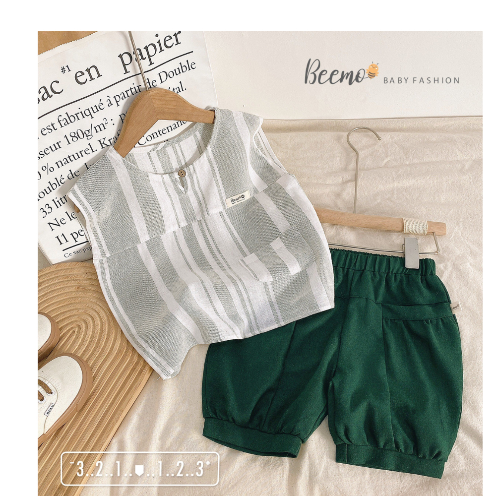 Giới thiệu Set bộ quần áo Beemo kẻ sọc áo ba lỗ, quần bomber mặc hè chất liệu đũi Hàn thoáng mát, mềm mại cho bé 1 - 7 tuổi 23158B