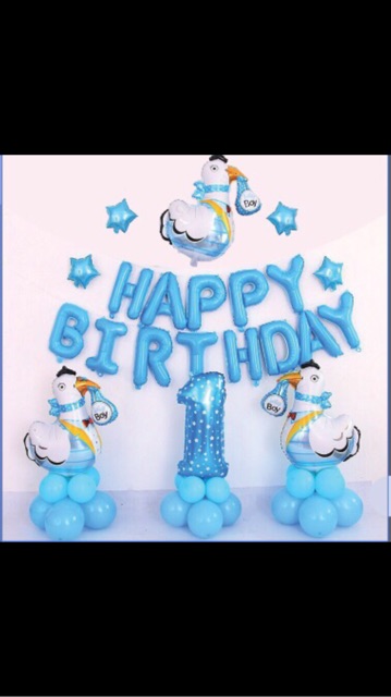 1. Bộ chữ gồm 13 chữ HAPPY BIRTHDAY (được chọn màu nếu khách không thích màu xanh, hồng) 2. Bóng gà size to 3 bóng và 12 bóng cao su màu 3. Số 1 to 60 cm và 4 sao trung 4. Phụ kiện đi kèm: bơm, băng keo