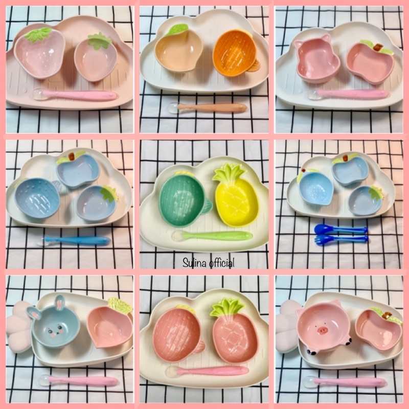 Giới thiệu set chén bát sứ ăn dặm cao cấp hình thú, hoa quả cho bé tặng kèm thìa báo nóng cao cấp Sulina official BD01