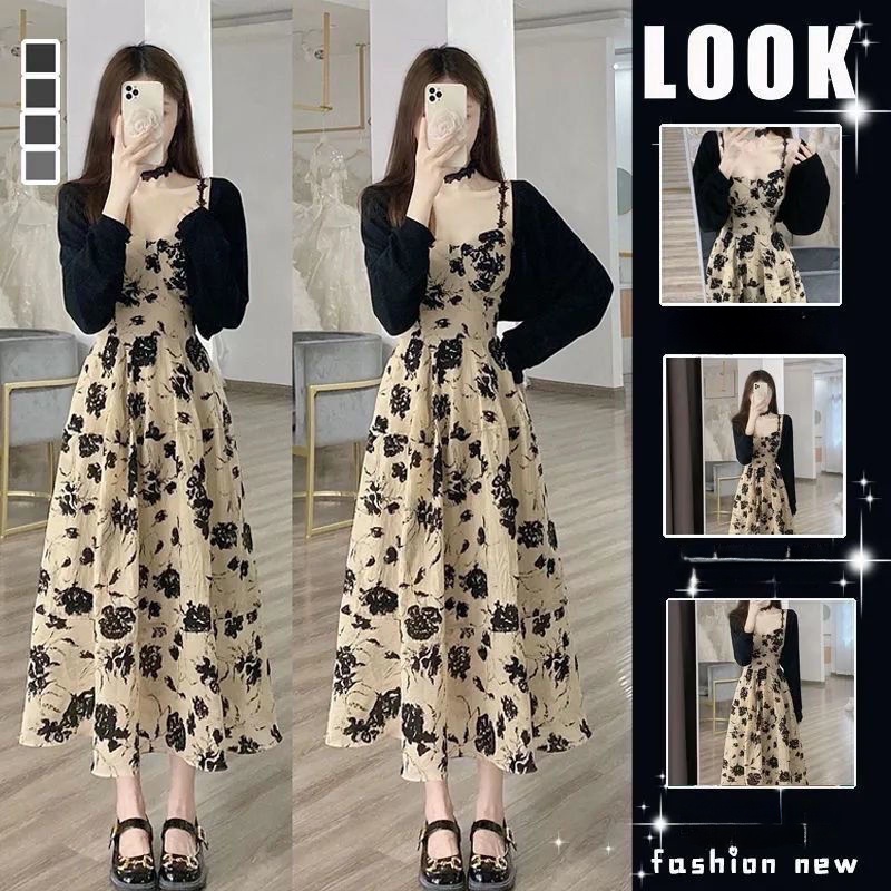 Thời Trang Nữ > Đầm/Váy > Set Đầm Hai Dây Và Áo Khoác Cardigan Họa Tiết Hoa Phong Cách Pháp Cổ Điển Thời Trang Mới