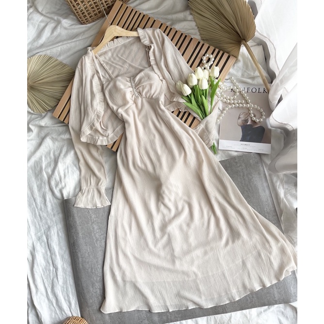 Giới thiệu SET ĐẦM KEM 2 DÂY NHÍU CƯỜM MIDI + ÁO KHOÁC CROPTOP BÈO KEM