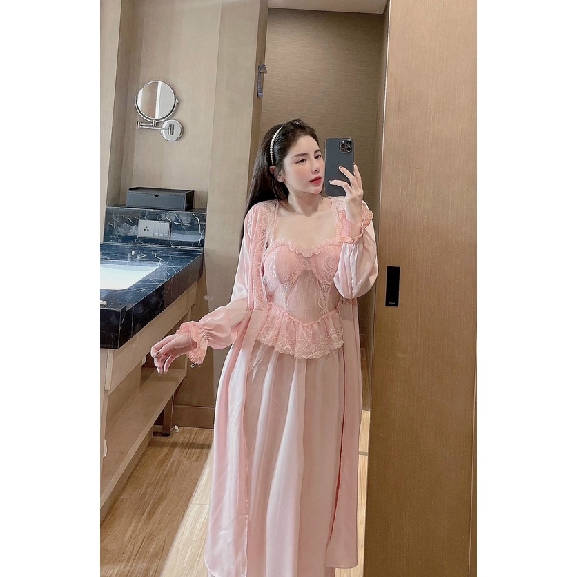 Set Đầm Ngủ Công Chúa 2 Dây Sexy Kèm Áo Choàng Lụa Xinh Xắn Freesize