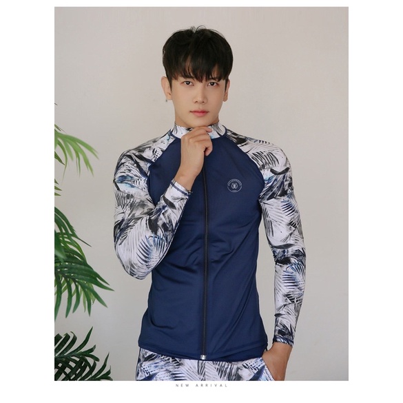 Giới thiệu Set đồ bơi dài tay quần đùi nam nữ khoá kéo ICELAKE XANH THAN TAY LÁ TRẮNG trẻ trung