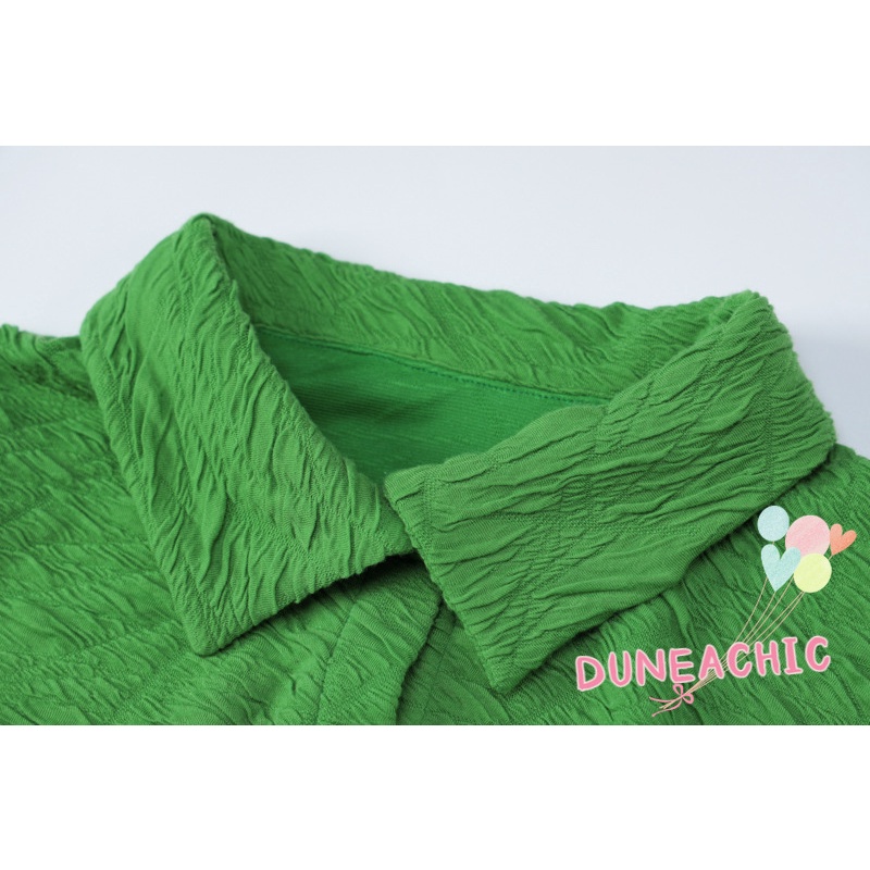 Giới thiệu Set đồ DUNEA gồm áo thun cổ bẻ phối hàng nút và chân váy lưng cao phong cách nữ tính