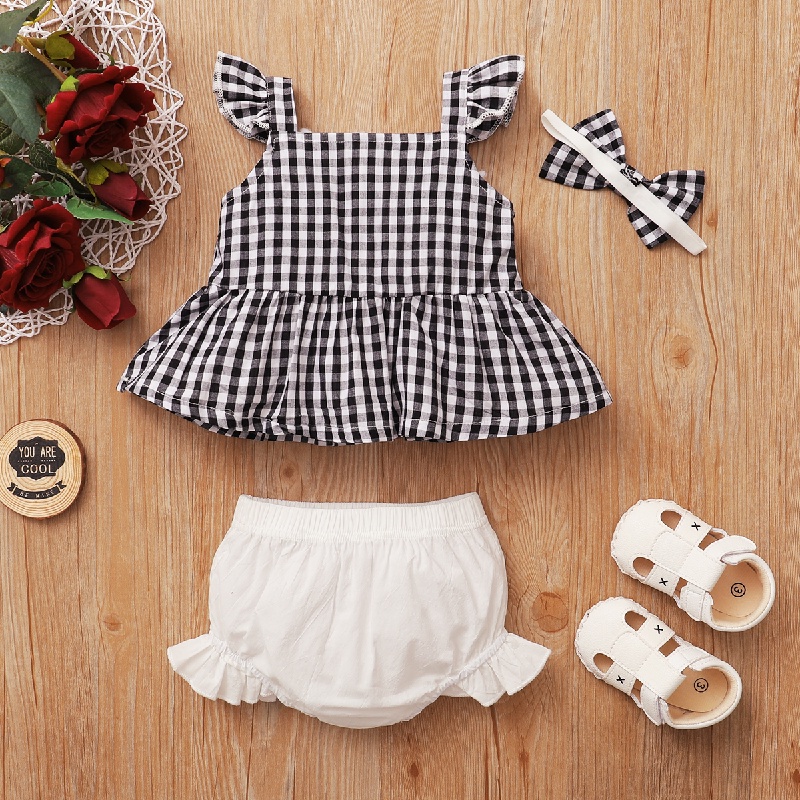 Giới thiệu Set đồ MIKRDOO gồm áo tay cánh tiên và quần short phối băng đô in caro thời trang cho bé gái