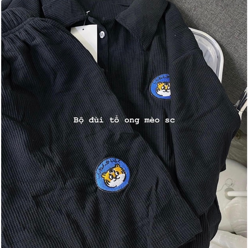 Giới thiệu Set đồ nam nữ form rộng unisex, áo polo cúc cài thêu logo mèo kèm quần short đùi chất liệu cotton tổ ong