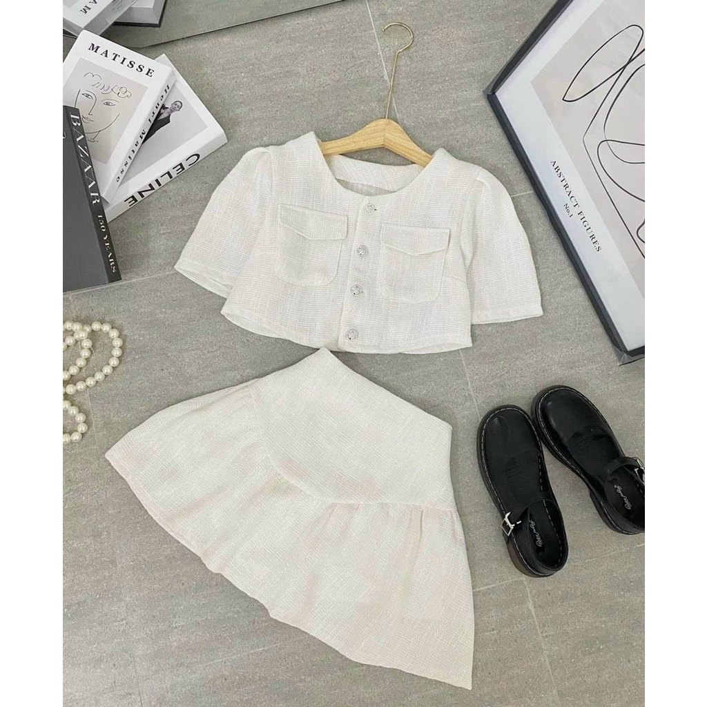 Giới thiệu Set đồ nữ áo kiểu tay lỡ, chân váy chữ a xếp ly màu xanh ngọc, trắng NPSET026