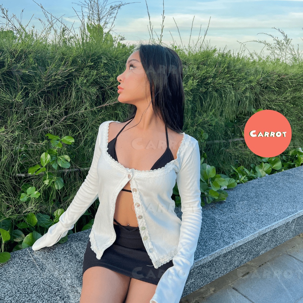 Giới thiệu Set đồ nữ đi chơi sang chảnh áo croptop tay dài ren chân váy ngắn ôm đen cột dây áo ngực bra ôm body Carrotxinhdep