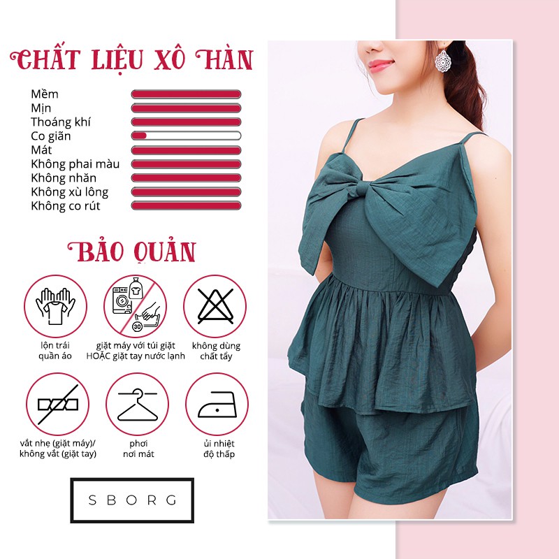 SBORG - Nổi bật, tinh tế và sang trọng. Chúng mình có bán bộ mặc nhà nữ mà bạn đang tìm! - Chất xô hàn mềm, mịn, mát. - Tuyệt đối không phai màu, xù lông. - Đường may chắc chắn, form đẹp, tôn dáng. - Luôn hỗ trợ đổi size/màu/mẫu. ----------------------------------- * Thông tin sản phẩm Set đồ nữ đi chơi SBORG quần áo thời trang nữ xô hàn: - Tên sản phẩm: Set đồ nữ đi chơi SBORG quần áo thời trang nữ xô hàn áo nơ 2 dây dễ thương quần đùi sexy freesize dưới 58kg quà tặng vợ - Chất liệu: xô hàn - Màu sắc: 8 màu như phân loại - Size: Freesize dưới 58kg Khách hàng vui lòng xem bảng size chi tiết ở phần hình ảnh sản phẩm hoặc chat với SBORG để được tư vấn size phù hợp. - Thương hiệu: SBORG (Việt Nam). Xuất xứ: Việt Nam ----------------------------------- * Hướng dẫn bảo quản sản phẩm Set đồ nữ đi chơi SBORG quần áo thời trang nữ xô hàn: - Giặt tay bằng nước lạnh + Lộn trái sản phẩm khi giặt + Không vắt và phơi lên. - Hoặc Giặt máy + Lộn trái sản phẩm và bỏ vào túi giặt + Giũ mạnh trước khi phơi lên. ----------------------------------- * SBORG cam kết về sản phẩm Set đồ nữ đi chơi SBORG quần áo thời trang nữ xô hàn: - Sản phẩm: Set đồ nữ đi chơi SBORG quần áo thời trang nữ xô hàn 100% giống mô tả. Hình sản phẩm là ảnh thật do shop tự chụp và giữ bản quyền hình ảnh. - SBORG cam kết tư vấn nhiệt tình, cẩn thận và kiểm tra kỹ sản phẩm trước khi gửi cho Khách hàng. Đảm bảo chất lượng sản phẩm và dịch vụ tốt nhất. - Hàng có sẵn, gửi hàng ngay khi nhận được đơn. Hàng được giao từ 1-5 ngày kể từ ngày đặt hàng tùy theo đơn vị vận chuyển. - Giao hàng trên toàn quốc theo hình thức COD hoặc qua ví Airpay. - Hoàn tiền nếu sản phẩm không giống với mô tả. Hỗ trợ đổi trả nhanh chóng theo quy định của Shopee ----------------------------------- * Quy định đổi trả sản phẩm Set đồ nữ đi chơi SBORG quần áo thời trang nữ xô hàn: 1. Điều kiện áp dụng (trong vòng 07 ngày kể từ khi nhận sản phẩm): + Hàng hoá vẫn còn mới, chưa qua sử dụng + Hàng hóa hư hỏng do vận chuyển hoặc do nhà sản xuất. + Hàng không đúng size, kiểu dáng, không đủ số lượng như quý khách đặt hàng + Hàng không vừa size khách hàng. 2. Trường hợp không đủ điều kiện áp dụng chính sách: + Quá 07 ngày kể từ khi Quý khách nhận hàng + Gửi lại hàng không đúng mẫu mã, không phải sản phẩm của Sborg + Không thích, không hợp, đặt nhầm mẫu mã, nhầm màu. Do màn hình và điều kiện ánh sáng khác nhau, màu sắc thực tế của sản phẩm có thể chênh lệch khoảng 3-5%