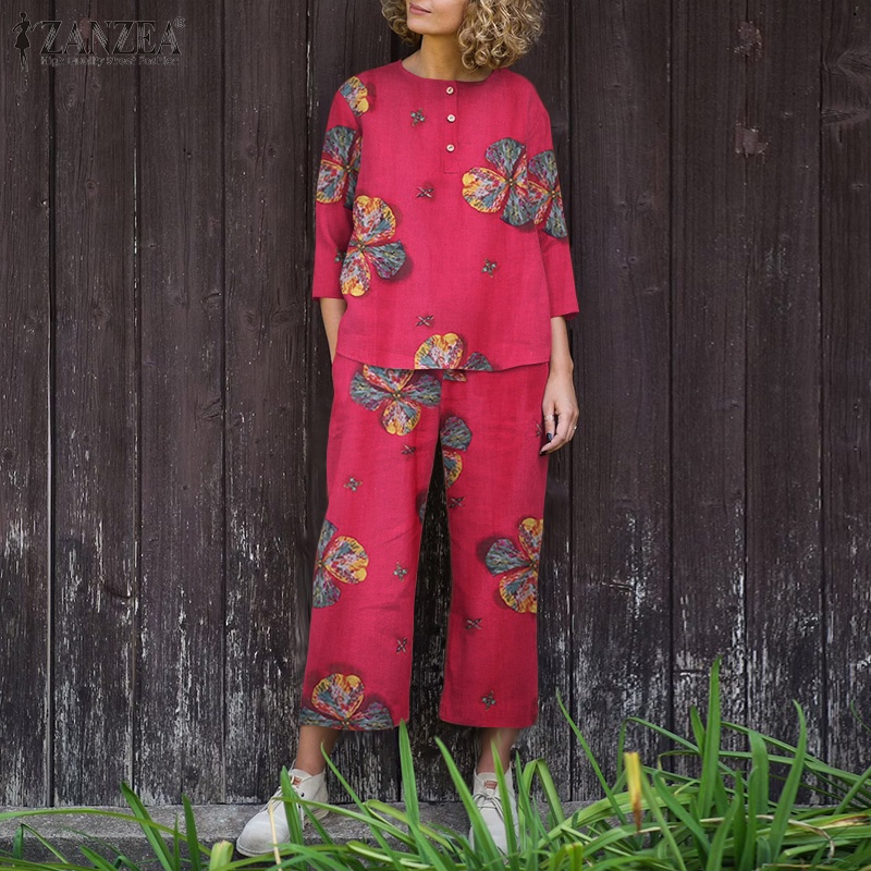 Giới thiệu Set đồ ZANZEA cổ tròn tay 3/4 cài nsut lưng co giãn in họa tiết giản dị dành cho nữ