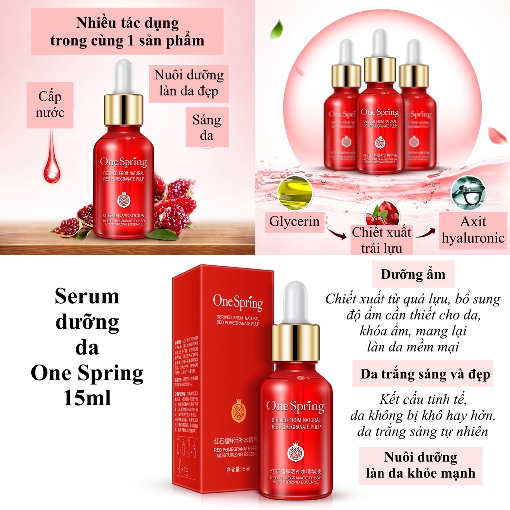 - Set dưỡng trắng da mặt One Spring gồm 4 món: 1. Sữa rửa mặt tinh chất lựu đỏ 100g 2. Toner dưỡng da 150ml 3. Serum dưỡng da 15ml 4. Kem dưỡng mắt 20g - Thương hiệu: One Spring - Xuất xứ: Nội địa Trung - Hiệu quả bộ sản phẩm: + Làm sạch sâu, loại bỏ bụi bẩn và tấy tế bào chết da mặt + Thu nhỏ lỗ chân lông, làm mềm da và sáng da + Mờ thâm, trẻ hóa làn da, da đều màu hơn + Tái tạo tế bào da khỏe mạnh, dưỡng mắt và cải thiện vùng da thâm hiệu quả 1. Sữa rửa mặt One Spring: Chiết xuất từ tinh chất quả lựu đỏ giúp làm sạch da, đồng thời nuôi dưỡng và giữ ẩm, với nhiều bọt, kết cấu mịn, dịu nhẹ, cân bằng nước và dầu, dưỡng ẩm, da mềm mịn, sảng khoái - Thành phần: Glycerin, chiết xuất từ trái lựu, yến mạch - Hướng dẫn sử dụng sữa rửa mặt: Nên tẩy trang trước khi sử dụng sữa rửa mặt + Bước 1: Làm ướt mặt. Lấy 1 lượng sữa rửa mặt cỡ hạt đậu cho vào lòng bàn tay, nhúng vào nước và bắt đầu tạo bọt + Bước 2: Thoa đều lên mặt, không tạo áp lực quá nhiều lên da và Massage theo chuyển động tròn. Vùng chữ T tiết dầu mạnh, bạn có thể dành thời gian Massage nhiều hơn + Bước 3: Rửa sạch mặt với nước Lời khuyên: Nên sử dụng ngày 2 lần (sáng và tối) 2. Toner dưỡng da One Spring: Làm sạch sâu làn da, bổ sung độ ẩm, da ngậm nước, nuôi dưỡng làn da ẩm mượt, mềm mại, sáng hồng tự nhiên, rạng rỡ và mịn màng, dưỡng chất thẩm thấu nhanh, sảng khoái và dễ chịu, không nhờn dính, thu nhỏ lỗ chân lông - Thành phần: Glycerin, chiết xuất từ trái lựu, hạt phỉ Bắc Mỹ - Hướng dẫn sử dụng toner: Sử dụng sau bước sữa rửa mặt + Bước 1: Lấy 1 lượng vừa đủ ra lòng bàn tay hoặc miếng bông tẩy trang và thoa đều lên mặt + Bước 2: Massage nhẹ nhàng theo chuyển động tròn cho đến khi sản phẩm được hấp thụ (khoảng 30 giây) 3. Serum dưỡng da One Spring: Chứa chiết xuất từ quả lựu đỏ, kết cấu mịn và tinh tế, nhẹ nhàng. Chăm sóc và dưỡng ẩm cho làn da, tươi mát, nuôi dưỡng làn da đẹp và khỏe mạnh. - Thành phần: Glycerin, chiết xuất từ trái lựu, axit hyaluronic - Hướng dẫn sử dụng serum One Spring: Sử dụng sau bước toner + Bước 1: Cho 1 lượng vừa phải ra lòng bàn tay hoặc bông tẩy trang và thoa đều lên mặt + Bước 2: Massage nhẹ nhàng theo chuyển động tròn, đừng tạo áp lực lên da Lời khuyên: Nên sử dụng ngày 2 lần (sáng và tối) 4. Kem dưỡng mắt One Spring: Nuôi dưỡng vùng da quanh mắt mềm mại và mịn màng. Nhẹ nhàng chăm sóc làn da mỏng manh của vùng da quanh mắt, bổ sung đủ nước, làm mềm da, cải thiện làn da khô, giúp da căng hơn, đàn hồi tốt hơn. Làm sáng vùng da quanh mắt, ngăn ngừa lão hóa và nếp nhăn. - Thành phần: Glycerin, chiết xuất từ trái lựu, quả bơ - Hướng dẫn sử dụng kem dưỡng mắt: Có thể sử dụng sau bước toner hoặc sau bước serum + Bước 1: Lấy 1 lượng vừa phải thoa lên toàn bộ bầu mắt (vùng da quanh mắt) + Bước 2: Dùng ngón tay đeo nhẫn của bạn (ngón áp út), Massage nhẹ nhàng theo chiều từ trong ra ngoài để kem hấp thụ hoàn toàn.