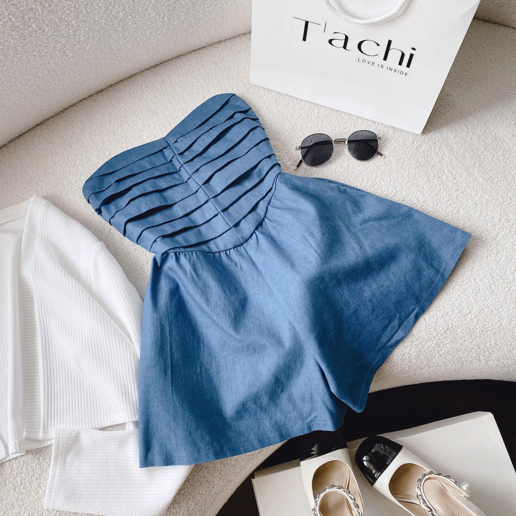 Giới thiệu SET JUMPSUIT DENIM XẾP LY NGỰC + KHOÁC CROPTOP TRẮNG