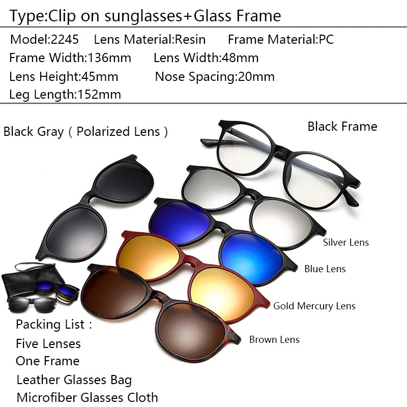 Gói hàng bao gồm: Tròng kẹp kính * 5 Gọng* 1 Túi da * 1 Vải lau kính sợi micro* 1