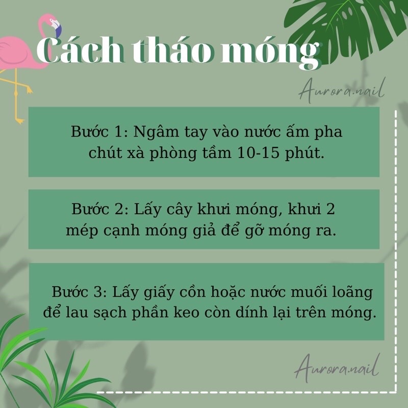 2. Cách gỡ móng tay giả: - Cách 1: Bạn nên ngâm móng tay vào nước ấm khoảng 20 phút hoặc nước rửa móng tay cho đến khi móng tay giả rời khỏi móng tay của bạn một cách dễ dàng. - Cách 2: Dùng keo #debonder (có bán tại shop) để gỡ ra đối với móng dùng keo dạng lỏng. Chỉ cần bôi nước tháo móng #debonder vào để 5-10p sau đó từ từ gỡ móng ra là ok.
