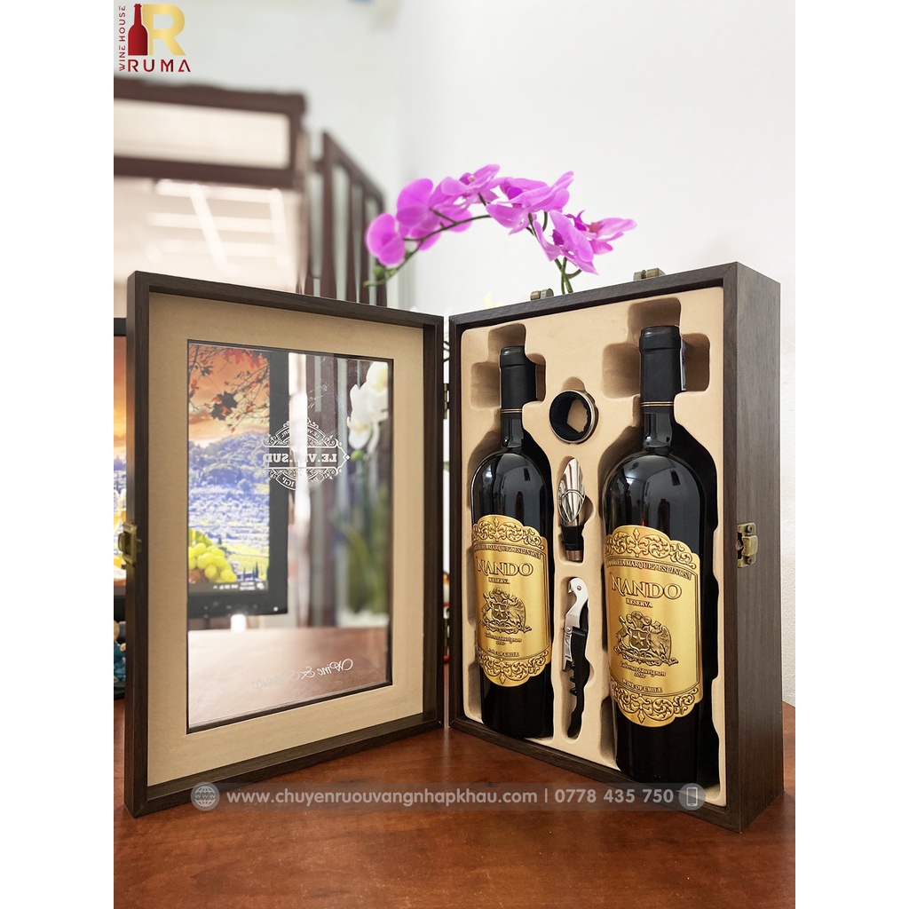 THÔNG TIN SET QUÀ TẶNG HỘP 2 CHAI VANG CHILE NANDO - HỘP GỖ CAO CẤP KÈM PHỤ KIỆN
