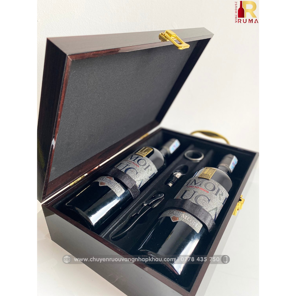 ● 1 hộp gỗ mặt phủ da PU cao cấp gồm 3 món phụ kiện đi kèm: khui rượu, dụng cụ rót rượu và vòng đệm cổ chai. Kích thước: 35.5 x 25 x 11 cm ● 2 chai rượu vang Ý LucaDimori nồng độ 14%. ● Có thể mua thêm túi giấy đựng hộp gỗ thiết kế hiện đại, sang trọng.