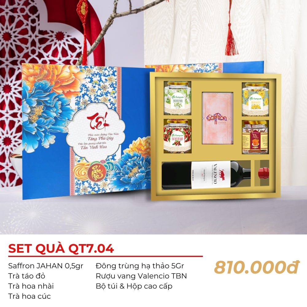 1. SET quà gồm: - 1 trà nhài sấy - 1 trà cúc sấy - 1 trà táo đỏ cao cấp - 1 đông trùng hạ thảo sấy thượng hạng - 1 Saffron Jahan 0,5gr - 1 chai vang Valencio TBN - Và Bộ túi và hộp cao cấp Ngày sản xuất in trên bao bì sản phẩm Hạn sử dụng 24 tháng 2. HƯỚNG DẪN BẢO QUẢN - Bảo quản nơi khô ráo, thoáng mát - Tránh ánh nắng trực tiếp để đảm bảo được chất lượng của sản phẩm. 3. Tại sao nên mua set quà Tết này? Hộp quà tết được thiết kế độc quyền đẹp mắt, tuy đơn giản nhưng lại rất thu hút. Rất phù hợp là quà biếu tặng người thân, bạn bè, đồng nghiệp. Dùng để tiếp khách trong những ngày Tết cũng rất là hợp lý. Sản phẩm an toàn chất lượng, có kiểm định của cơ quan chức năng Phụ kiện đi kèm mang dấu ấn, đồng bộ Nhân viên tư vấn trực 24/24 giải đáp mọi thắc mắc nhu cầu của khách hàng. Hỗ trợ in logo, thiệp sản phẩm theo yêu cầu của doanh nghiệp. Giá cả hợp lý phù hợp với nhu cầu của khách hàng. Công ty có giấy tờ đầy đủ, hỗ trợ xuất hóa đơn cho doanh nghiệp.