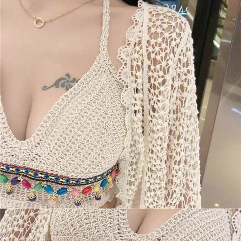 ĐẶC ĐIỂM SẢN PHẨM - Chất liệu ren - Áo 2 dây ren có hạt + quần ren + khoác ren - Mặc vào mềm mại, thoáng mát, dễ vận động - Style thanh lịch, nữ tính, thời thượng - Phù hợp mặc vào dịp hàng ngày, đi chơi, du lịch... - Free size, 40-56kg - Màu: trắng, kem