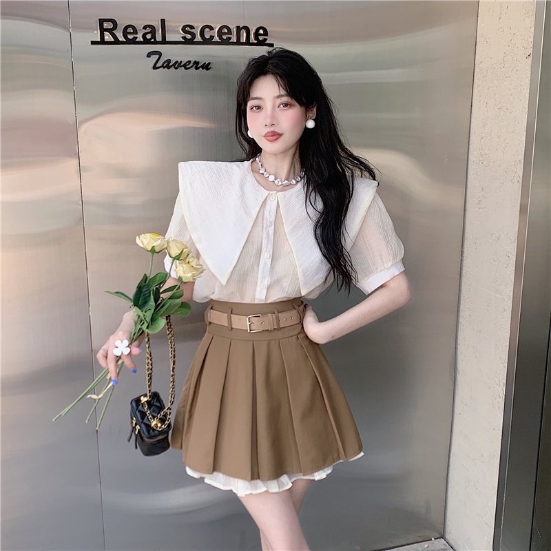 Set Váy + Áo Sơ Mi 💖 Chân Váy Xếp Ly Có Đai Rời Kèm Áo Sơ Mi Cổ Nhọn Siêu Xinh Hk Shop9720