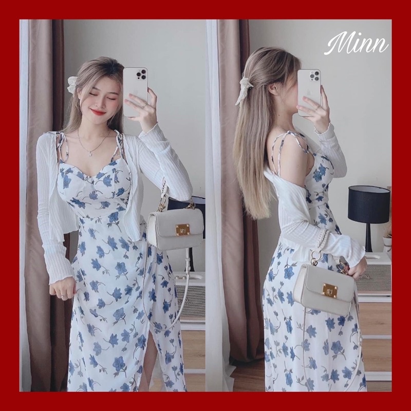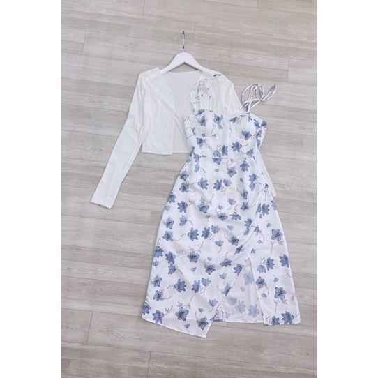 Giới thiệu Set váy hoa hai dây cúp ngực xẻ tà mix cadigan trắng tiểu thư