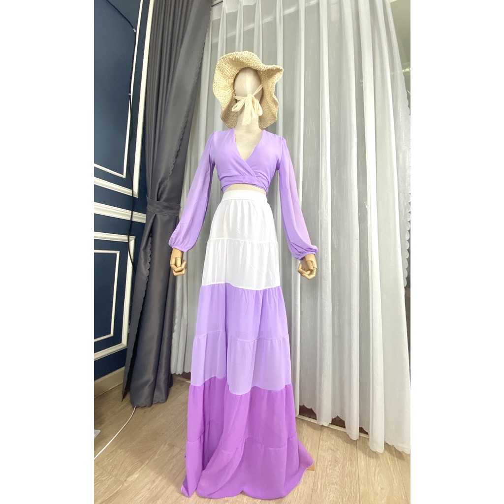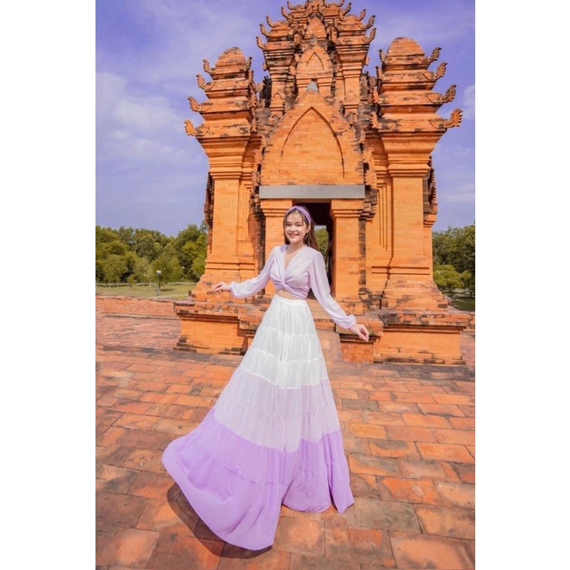 Set váy maxi đi biển dáng xòe tiểu thư phối loang màu xinh đẹp dễ thương cá tính thời trang XUKA-DRESS DT019