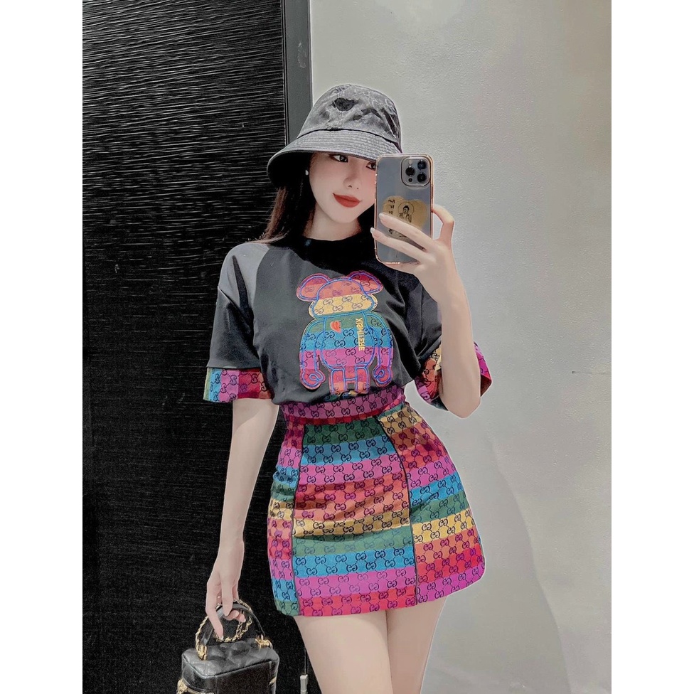 Giới thiệu Sét Váy nữ mùa hè áo cotton tay ngắn cổ tròn in gấu kèm chân váy cộc kaki cầu vòng cho nữ dạo phố mùa xuân hè