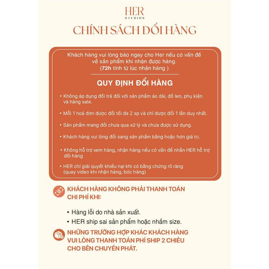 1.Thông tin mẫu - Chiều cao: 167 cm - Cân nặng: 50 kg - Số đo 3 vòng:83-65-93 cm * Mẫu mặc size S * 2. HƯỚNG DẪN BẢO QUẢN: - Nên giặt tay / giặt khô - Hạn chế giặt bằng máy - Sử dụng nước giặt nhẹ nhàng - Không dùng chất tẩy mạnh - Dùng bàn là hơi , phơi sản phẩm ở nơi có bóng râm - Không dùng bàn là nhiệt , tránh phơi đồ trực tiếp dưới ánh nắng 3.CAM KẾT CỦA Her25 : ✔ Hàng thiết kế và sản xuất 100% Made in Vietnam bởi Her25. ✔ Hình sản phẩm là ảnh thật 100% do Her25 chụp, sản phẩm gửi đi là sản phẩm giống hình. ✔ Hàng đã được cắt chỉ thừa và kiểm tra trước khi gửi đi.