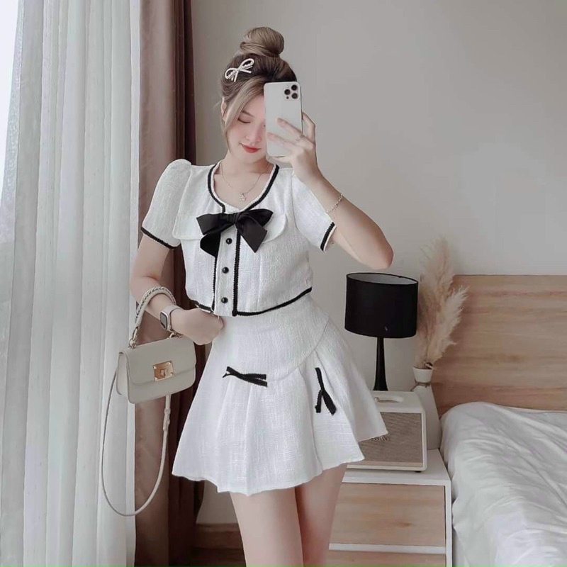 Giới thiệu Sét váy thời trang nữ mặc đi chơi chất xốp trắng tiểu thư kèm nơ đen phối viền váy xếp ly