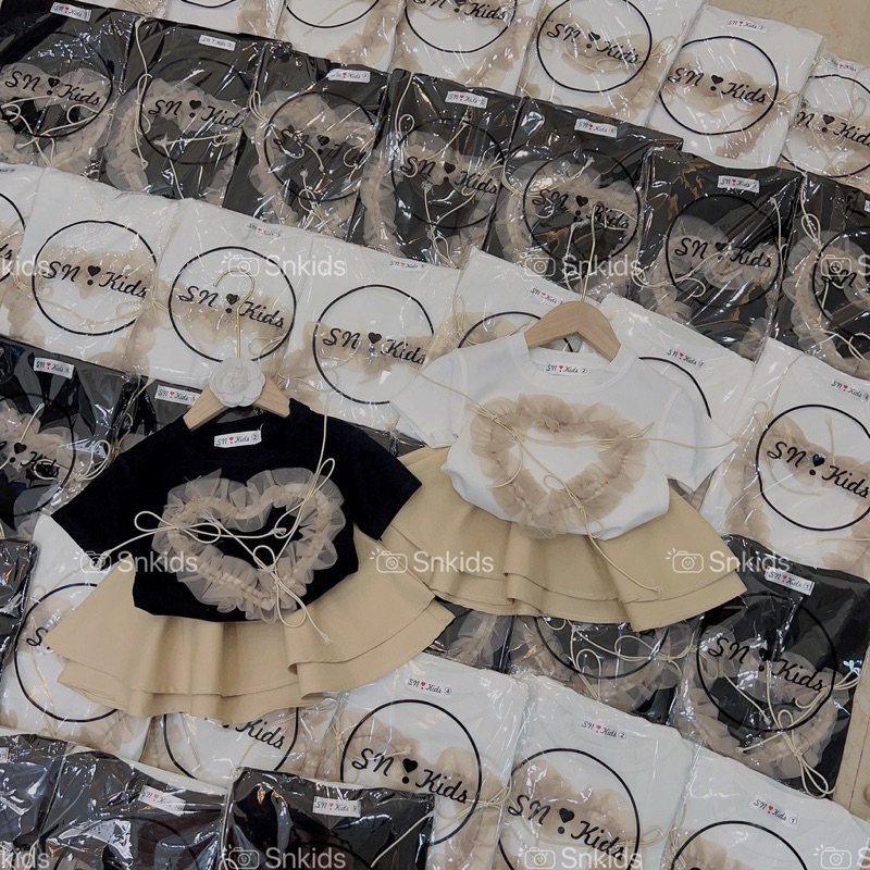 sét váy ka ki + áo phông ren tim kiểu cho bé gồm 2 màu đen và trắng ri 10 size từ 1-10 sỉ ib