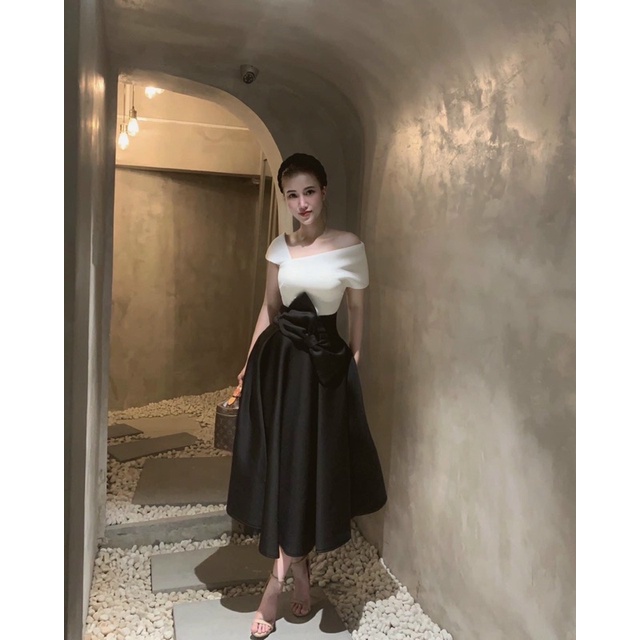 Váy trắng trễ vai phối chân váy đen nơ eo thích hợp cho mùa cưới và chụp kỉ yếu. Thích hợp Đại tiệc cô dâu, cưới hỏi, dạo phố, picnic, đi tiệc, chụp hình sống ảo, sự kiện,....
