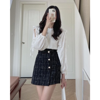 [Ảnh thật/Video] Set áo babdydoll cổ bèo thắt nơ mix chân váy trắng xếp li siêu xinh
