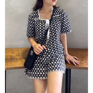 (HÀNG SẴN) Set Áo + Quần đùi chất ren thêu màu xanh đen đậm