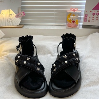Dép Quai Ngang Đính Ngọc Trai Đế Bằng Phong Cách Hàn Quốc Thời Trang Mùa Hè Cho Học Sinh
