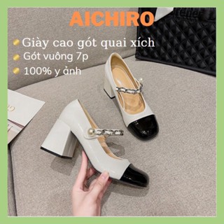 Giày cao gót da bóng gót 7P quai ngang phối xích ngọc cực xinh, phụ kiện thời trang Aichiro