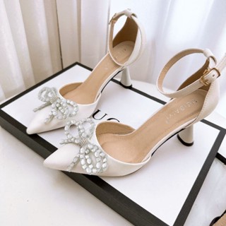 Giày Cao gót Bít Mũi Đính Nơ Hạt Ngọc . kiểu Giày Kim Xa gót 7 phần