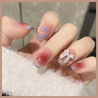 Móng tay giả đính đá họa tiết xanh da trời móng giả đính nơ cá tính