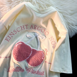 NUZIRO Áo thun tay ngắn cổ tròn thêu họa tiết cherry thời trang cho nữ
