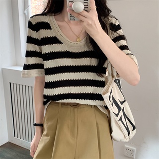 NUZIRO Áo Thun Nữ Ngắn Tay Cổ Tròn Sọc Ngang Thời Trang