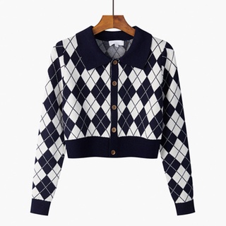 NUZIRO Áo croptop tay dài cổ bẻ họa tiết sọc caro phong cách cổ điển