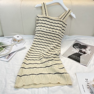 NUZIRO Áo tay ngắn/ Đầm hai dây dệt kim ôm dáng họa tiết kẻ sọc màu trơn thời trang mùa hè cho nữ