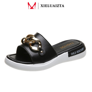 Dép XIELUAIZTA mũi vuông đế bằng phối dây xích kim loại thời trang Hàn Quốc cho nữ