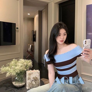 Áo Croptop Dệt Kim Trễ Vai Tay Ngắn Họa Tiết Kẻ Sọc Thời Trang Mùa Hè Cho Nữ