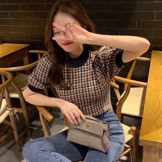 Áo Thun Dệt Kim Ngắn Tay Họa Tiết Houndstooth Thời Trang Mùa Hè