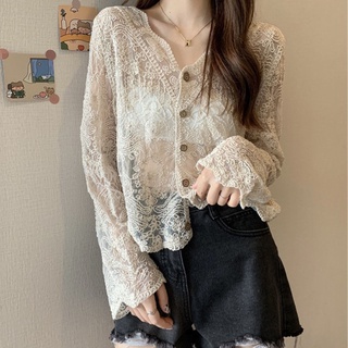 Áo Kiểu Tay Dài Phối Ren Phong Cách Hàn Quốc 189655 Áo Sơ Mi Chống Nắng Cổ Chữ v Dễ Phối Đồ Phong Cách Phương Tây