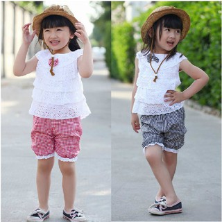 Set áo ren ngắn tay có đính nơ kèm quần họa tiết ca rô dễ thương cho bé gái