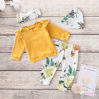 Set quần áo dài tay + mũ + băng đô nơ chất vải cotton in hoa đáng yêu cho bé gái