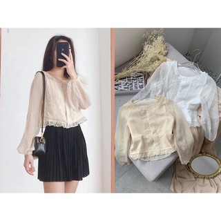 Áo voan chấm bi nổi cổ tròn viền ren khuy dọc