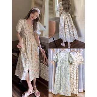 Váy hoa nhí xanh xẻ tà dúm ngực tay bồng sang chảnh